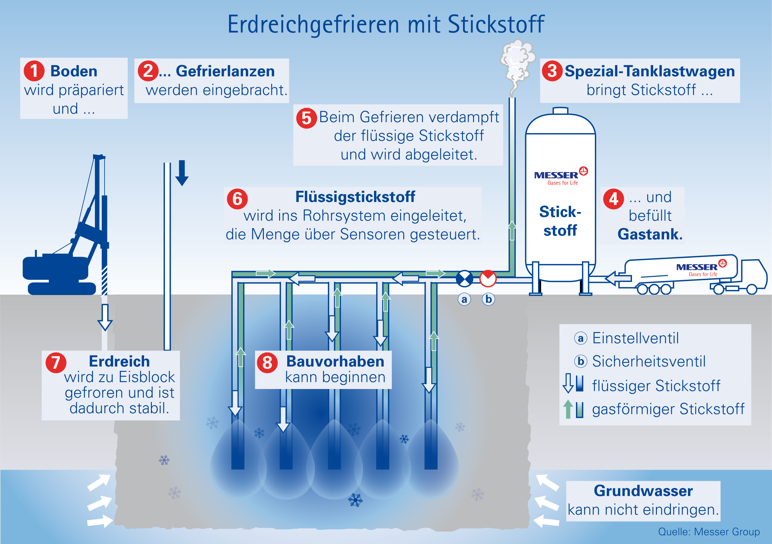 Der schnellste, einfachste und sicherste Weg, dies zu erreichen, ist das Gefrieren des Bodens mit flüssigem Stickstoff (LIN). Flüssiger Stickstoff hat eine Temperatur von minus 196 Grad Celsius und verwandelt den Boden um die Baustelle herum in einen stabilen, wasserundurchlässigen Eisblock. Damit ist die Baustelle auch vor Grundwasser geschützt.