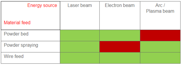 Today's processes for the additive manufacture of metals can be classified according to material feed and energy source: